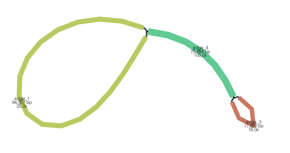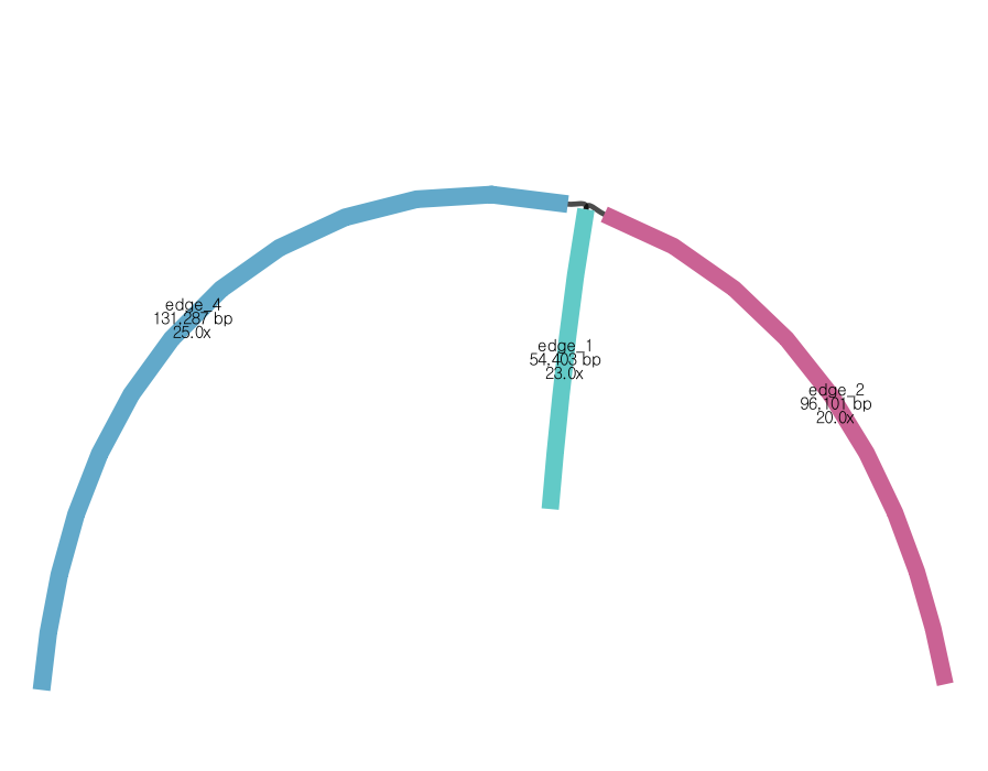 1) egde4-edge1 (185,690 bp)과 2) edge2-edge1 (150,540 bp)의 두 가지 linear from으로 존재할 수 있음을 의미함.